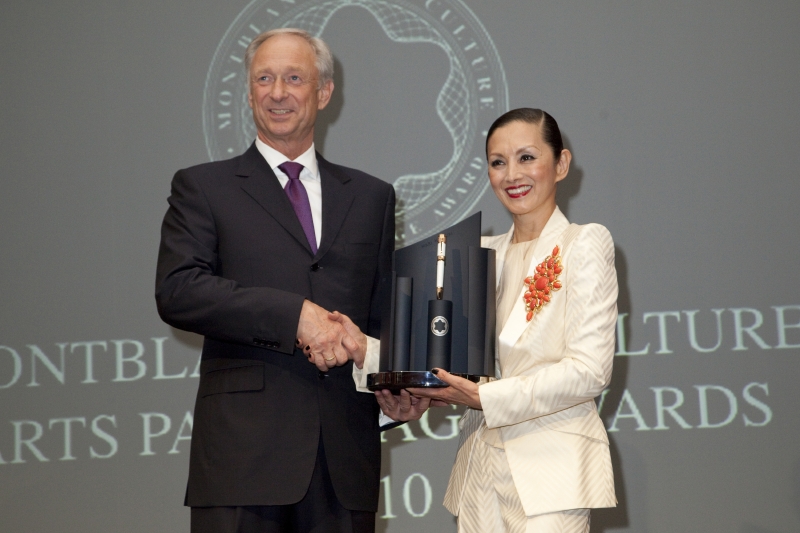 上段:モンブラン インターナショナル CEO、ルッツ・ベッケさん と受賞者の夏木マリさん。下段:セレモニーの最後を飾ったのは、パーカショニストの斎藤ノブさんも参加した夏木マリさんのライブパフォーマンス。モンブラン文化財団が主催するこのアワードは、文学、音楽、演劇、デザインなどあらゆる芸術分野において、若い才能の開花に尽力した支援者に贈られるもの。世界11カ国のモンブラン現地法人が候補者を選出し、著名な芸術家が審査員となって受賞者が選ばれます。今年で18回目を迎え、過去の受賞者にはそうそうたる人物・団体が並びます。受賞者には15000ユーロと、限定生産された万年筆が贈られますが、すべての人が賞金を自ら支援する団体などに寄付しているのも特徴です。芸術を愛する人々の地道な活動を広く世に知らしめ、そうした活動を陰ながら支えてきた意義深いアワードといえるでしょう。