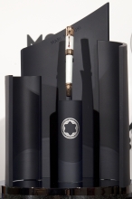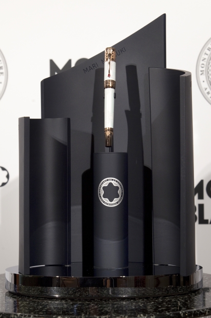 右:受賞者に贈られたトロフィーとモンブランの万年筆「エリザベスⅠ世」。世界限定12本のみ生産された特別仕様で、うち11本が世界11カ国の受賞者に贈られ、 残りの1本はモンブラン ミュージアムに保存される。