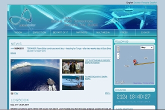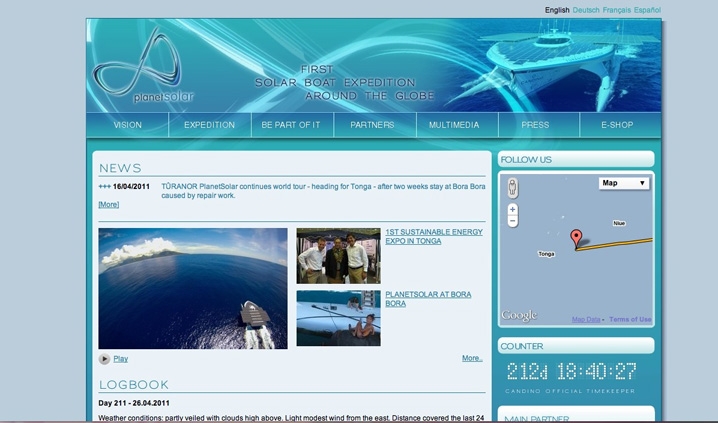 構想から5年、4度の改良を経て完成したオフィシャルウェブサイト(www.planetsolar.org)は、「プラネットソーラー号」の航路をほぼ1分間隔で追うことができるシステムが特徴だ。航海中の体験や発見などを綴ったログブックは毎日更新される。新機能のe-コマースサイトでは、オフィシャルグッズの購入を通して、このプロジェクトのサポーターになれる。
