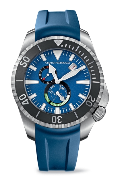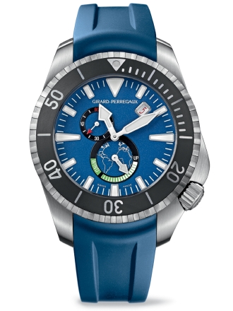 同モデルはロックフェラー夫妻の環境問題への取り組みに敬意を表し制作されたものだ。スティール製ケースとブルーのラバーストラップ、さらにダイヤルのブルーが印象的なデザイン。そして文字盤には、海を守るというこの理念を象徴する世界地図があしらわれている。シーホーク プロ1000mは、人間工学に基づいた個性溢れるデザインのダイビングウォッチで、極限の冒険に備えパワーリザーブ表示のあるジラール・ぺルゴ社製の自動巻ムーブメントが搭載される。また潜水時間を確認する単一方向回転べゼル、深く潜水した後に減圧するためのヘリウムバルブが備わっている。