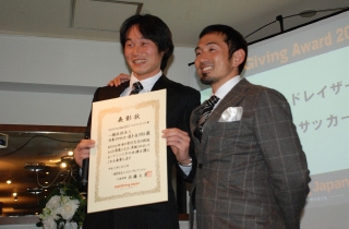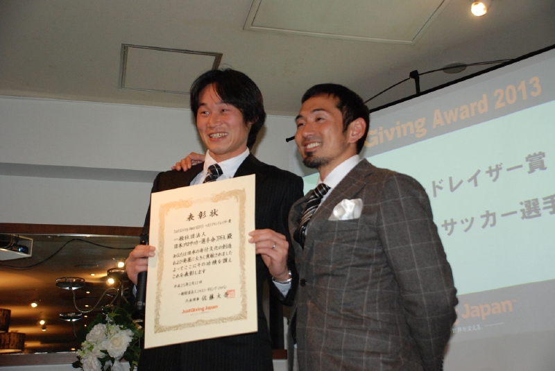 日本サッカー協会は東日本大震災を受けた2011年末「クリスマス・チャリティサッカー」を企画し、全国のサッカーファンに向けた募金活動の結果、24,899,100円という多額の寄付をJustGivingを通じて集めた。現在も被災地でサッカー教室を定期的に開催するなど活動を行なっている。受賞式には、前コンサドーレ札幌DF岡山一成選手が登壇し、喜びを語った。「サッカーの力とは本当にサポーターに支えられているものです。このチャリティマッチを開く上で、僕たち選手会が真っ先に頼ったのがサポーターでした。この企画に賛同してくれたサポーターの思いをJリーガー一人ひとりが大切に受け止めています。またこの活動の一環で、僕は「夢先生」として、子どもと夢について語り合う活動もしています。その中の1人の子が、大工さんになって壊れた家を自分の手で直したいと目に涙を溜めて教えてくれました。復興というのは、こうした子どもたちが夢をかなえようとする年齢になるまで続くと思います。僕もサッカーの力を信じてひとりでも多くの人にこの思いを伝えていきたいと思います」。