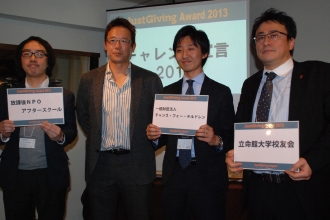 アワードの後半では、古田敦也氏による2013年のチャレンジ宣言が行なわれた。マラソンやトライアスロンなど、JustGivingを通じて様々な挑戦をし続けている古田氏だが、今年はどんな団体を支援するのだろうか。今回候補になったのは、子どもたちの放課後活動を支援する「放課後アフタースクール」、被災地の子どもたちに塾や習い事に使うことができるバウチャーを届ける「一般法人財団チャンス・フォー・チルドレン」、立命館大学交友会による「未来人材育成会」の3つの団体。それぞれ2分30秒のプレゼンテーションを行ない、古田氏が審査をした。「正直申し上げて、まず(古田氏の母校である)立命館大学は今回はなしということで(笑)。まぁ、結果的に3つとも今後コミットすることになるかと思いますが……。今回は放課後アフタースクールさんを支援させていただきます。今年もいろんな形でチャレンジしていくなかで、放課後アフタースクールの活動を支援していけたらと思います。今後メディアなどでもお伝えしていきますので、ぜひみなさん応援宜しくお願い致します」。