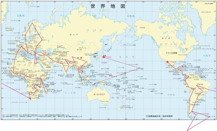 2010年3月 アメリカ → メキシコ → グアテマラ→ ベリーズ → キューバ → エクアドル → ペルー → ボリビア→ ブラジル → アルゼンチン → 南極 → 南アフリカ → ナミビア → 中央アフリカ → ヨーロッパ各国 → 中東各国 → アジア各国 → 太平洋諸島 → 2011年(?)沖縄にてゴール