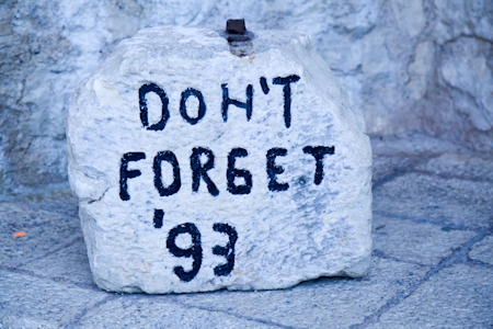 モスタルの街を歩いていると、「Don’t Forget ‘93」と書いた石碑を見かける。それは内戦時の1993年、この街で大きな戦闘があり、街は廃墟と化し何人もの死者が出た経験のことを忘れないためのものであるという。また墓場を通り過ぎたとき、そこにずらりと並ぶ無数の墓石の大半には1993と刻まれていた。それを見ていると、とても生々しく身近に紛争を感じ、心が落ち着かなくなってきた。雨は降り止まず、重苦しい気分が覆いかぶさる。
